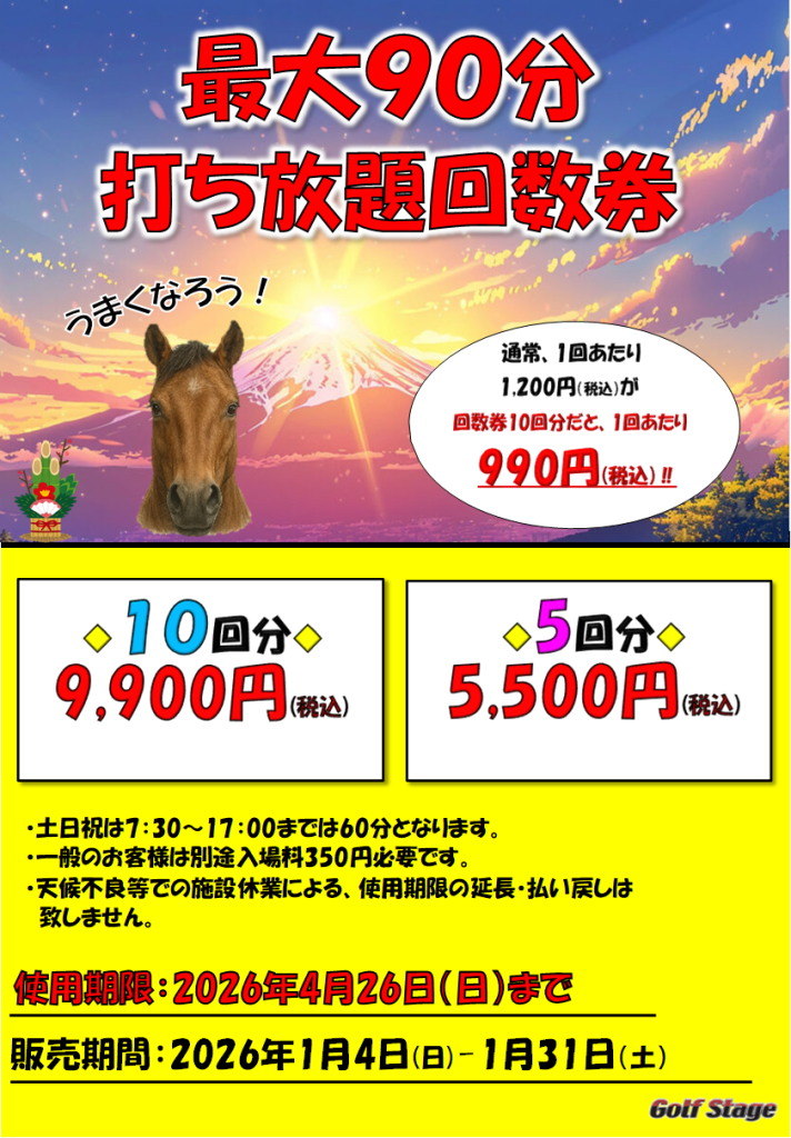 通常1回あたり1,200円の打ち放題がお得に利用できる、打ち放題回数券販売のお知らせです⛳